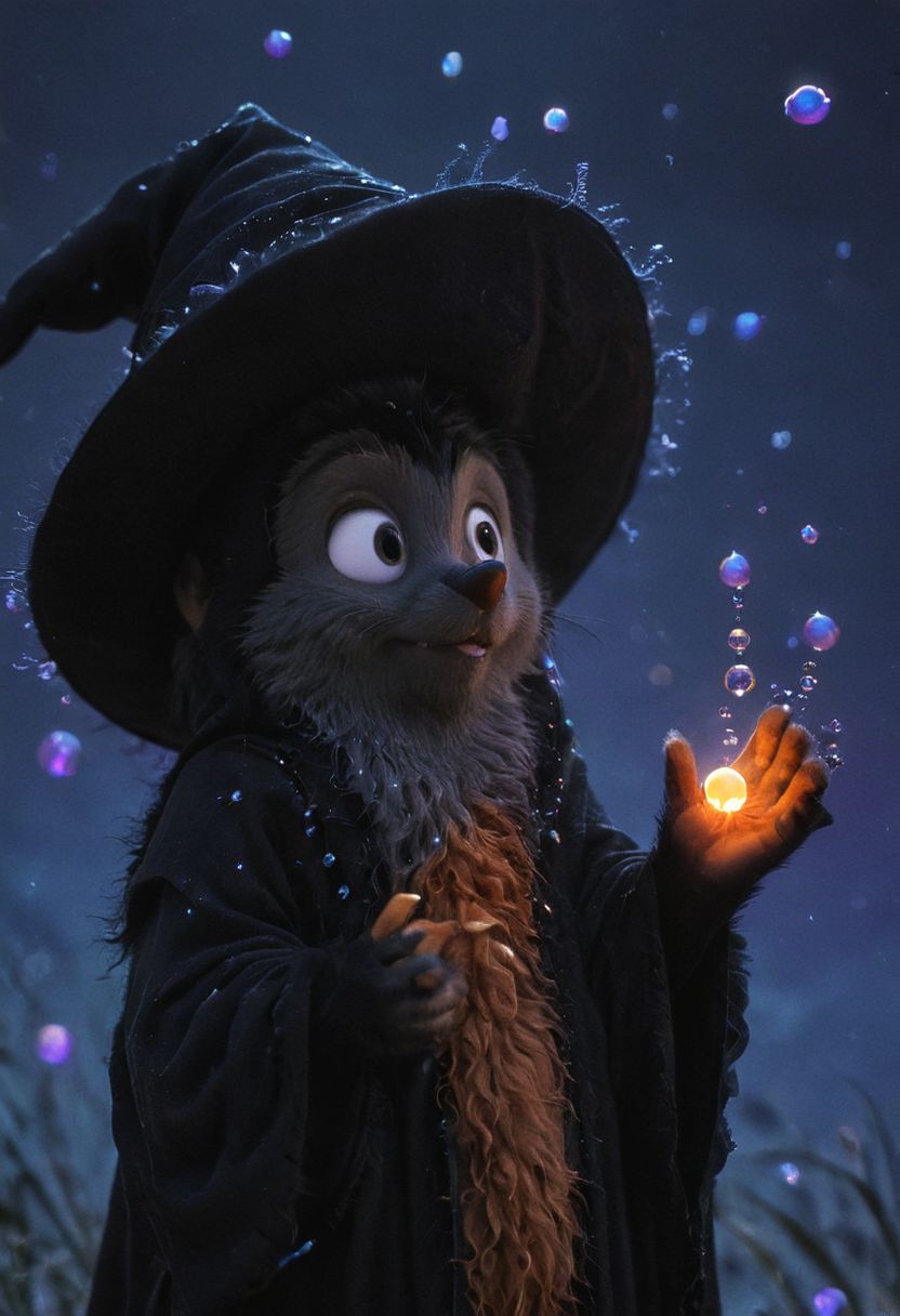 Closeup portrait. face closeup, 3d depth of field Simulation, closeup portrait of an fluffy high detailed furry oriental little mole hkmagic black wizard with pointy hat at night, waving arm, blue/purple translucent bubbles floating around, high collar translucent Night gown, orange glowing translucent, oriental desert themed city, realistic, depth of lenticular, dramatic, bold lines async, deep blacks, illuminated from behind, holy Aura, Long dense grown river
