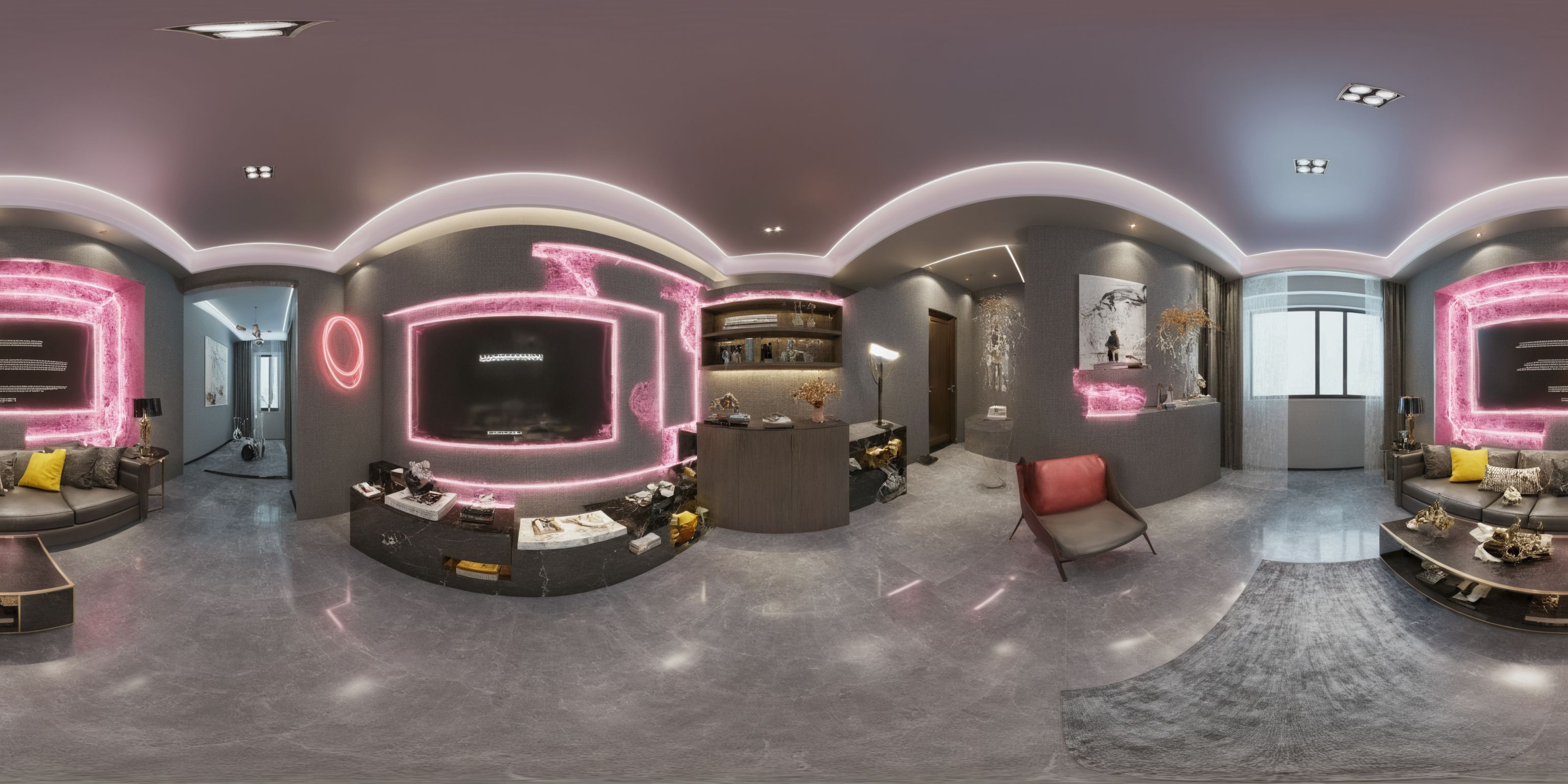 Neon noir <lora:JJsPanoramicLivingroom_XL:1>, ((Panoramic)), ((livingroom)), ((masterpiece)), ((best quality)), realistic, high detailed, (indoors) , no human, window, curtain, table, rug, sofa, television, ceiling light, (modern), . Cyberpunk, dark, rainy streets, neon signs, high contrast, low light, vibrant, highly detailed