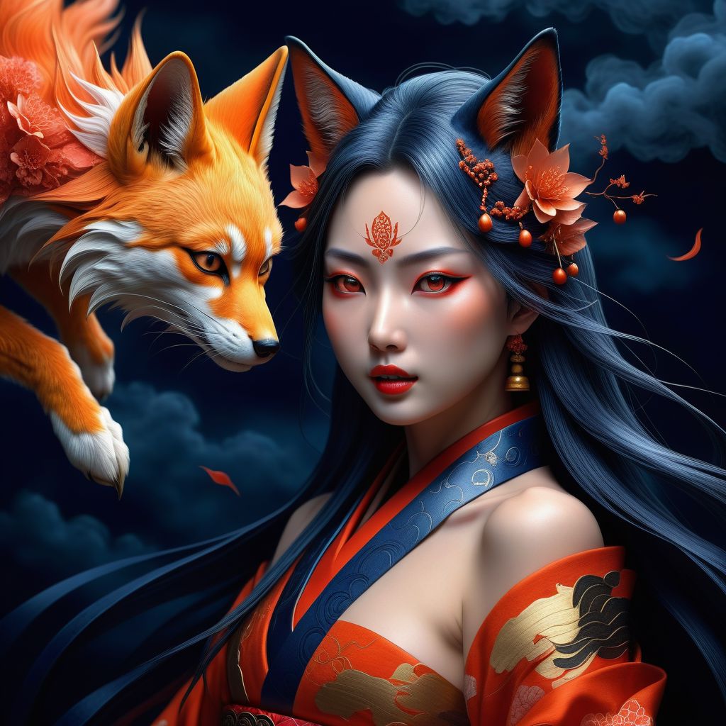 Ultra realistic color pencil image a kitsune in female form, seducing a samurai.. BREAK Deep dark intense midnight blue misty background, Dark theme, dynamic lighting, (soft shadows), (soft focus), (photo realistic), uhd, 8k
