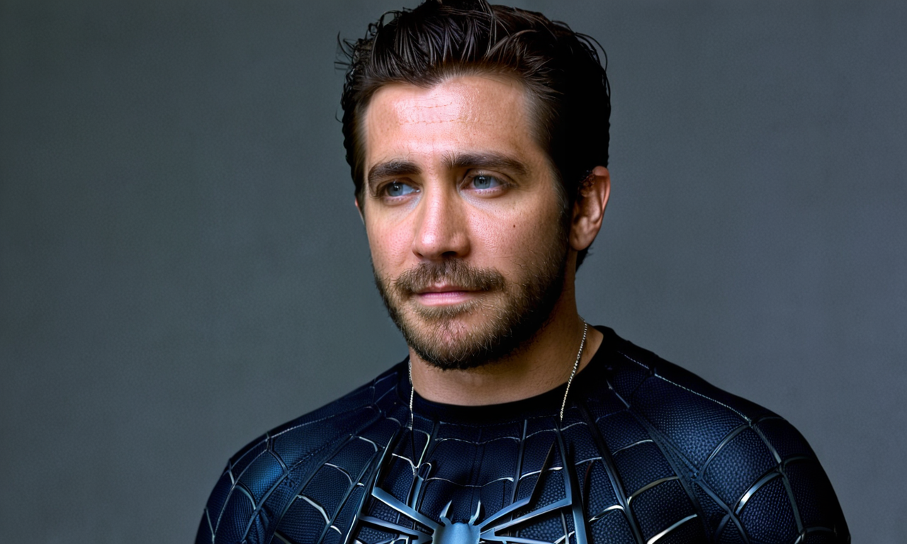 Gyllenhaal, <lora:gyllenhaal-128:0.9>, black hair, beard, spidermen, medium full shot