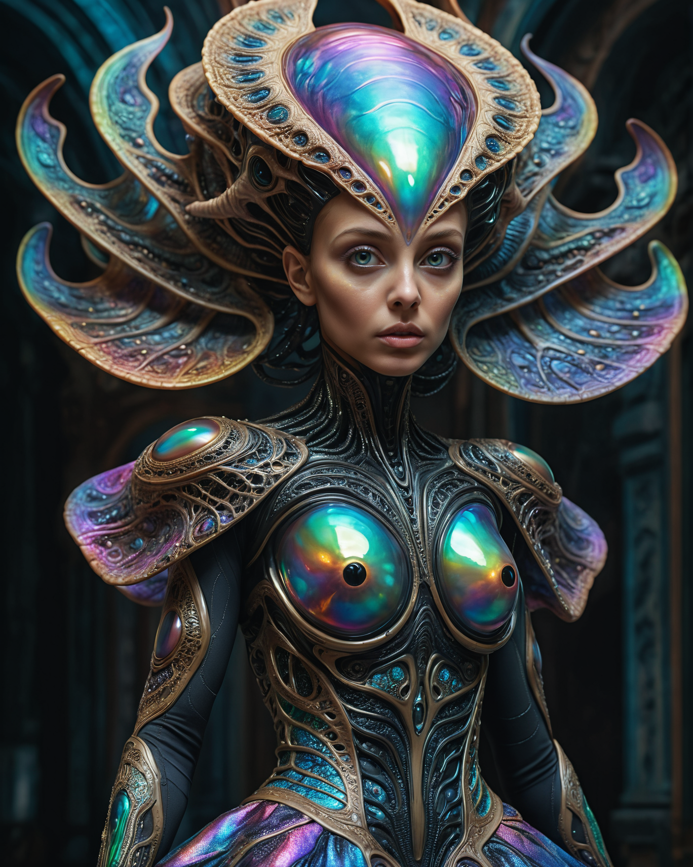 artistic, iridescent gorgeous female alien with deep eyes, uncanny creature, flowing billowing neoprene dress, extremely detailed, intricate motifs, deep depth of field, bright dramatic lighting, radial patterns, maximalist, intricate filigree, macro photography, by Evan Monteiro,by Sam Spratt, by Ismail Inceoglu, hyperrealistic masterwork by head of prompt engineering <lora:xl_more_art-full_v1:0.5> <lora:hyperkraximalism_v1-1:0.3>