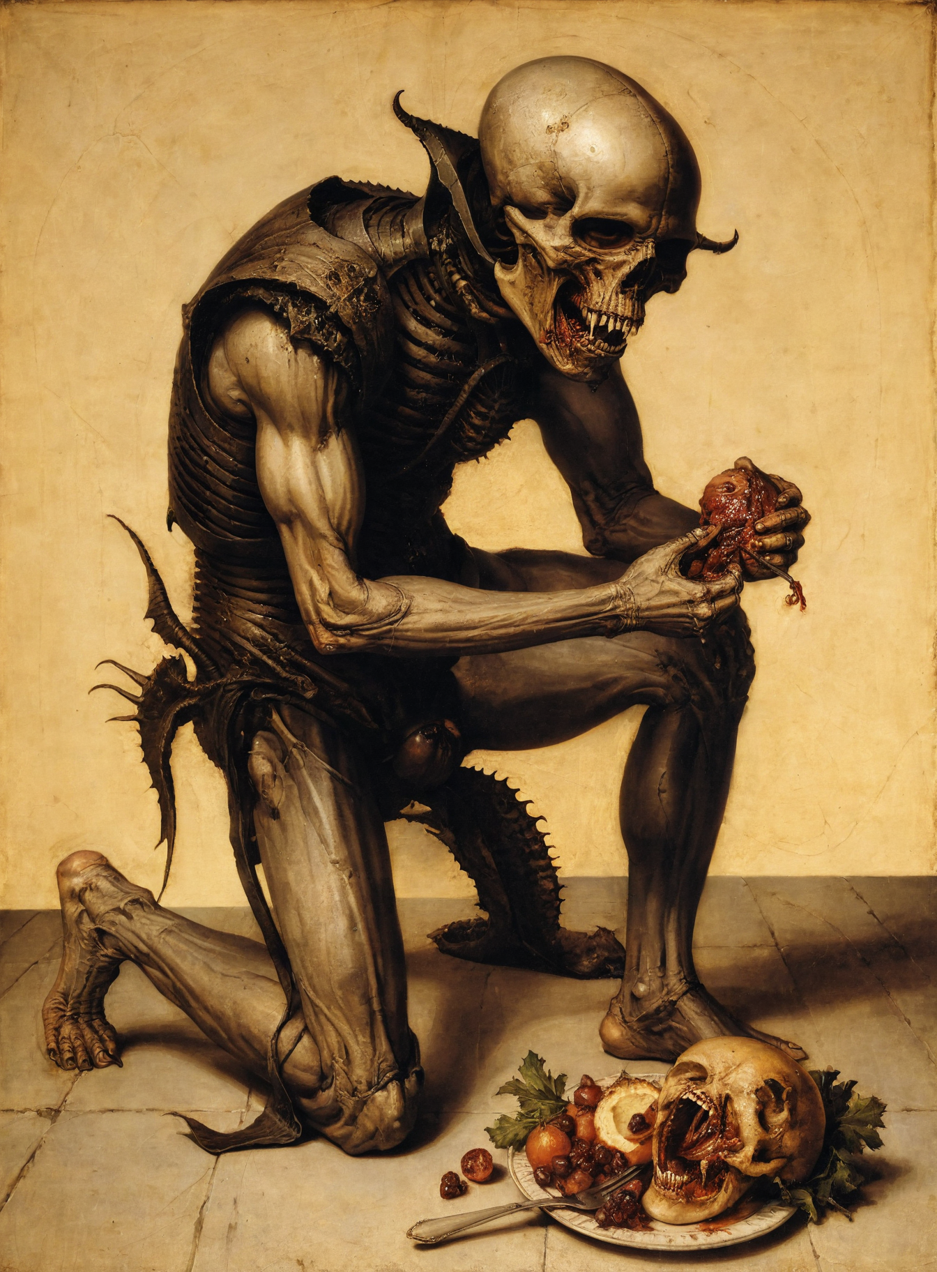 a renaissance painting of a man kneeling,eating,horror,dreadful,ugly,death,<lora:g1g3r:0.8>,teeth,<lora:add-detail-xl:1>,(skull:0.5),