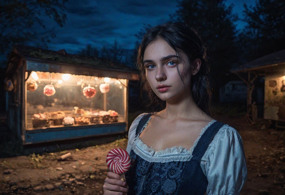 an old, abandoned sweets stand, in the night, the scenery appears dark and eerie, Slavic beauty with a sweet face holding a large lollipop in her hand is in the foreground, black hair, blue eyes, realistic picture