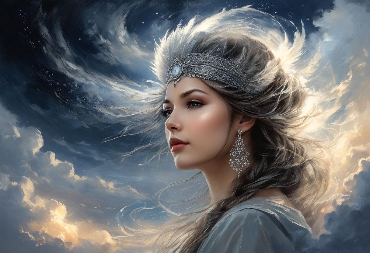 (masterpiece), (best quality), (ultra detail), Charcoal and chalk drawings. Sketch, (Hyperrealism), (in the style of Marc Simonetti: 1.4), (masterpiece: 1.2), (A female intelligent cloud with an ever-changing form, decorated with a swirling ensemble of steam and lightning, a composition inspired by atmospheric phenomena and meteorological patterns, in a unique masterpiece outfit and avant-garde headdress: 1.1), (lit by the ethereal glow of the moon and stars against a vast open sky filled with swirling clouds and distant thunderstorms: 1.1), (hyper-detailed: 1.1), (intricate details: 1.0), (Exquisite details:1.1), (best quality:1.1), (very stylish detailed modern haircut, mesmerizingly detailed shining face, mesmerizingly detailed beautiful eyes:1.2) painting in the style of Anders Zorn, Alexi Brilot, Luisa Royo