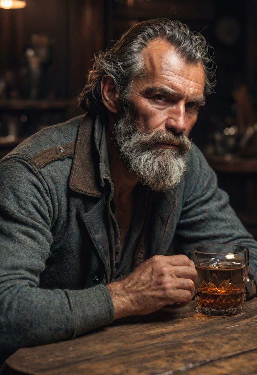 Moebius (Jean Giraud) Style page, a portrait of a seaman with a rugged, thick beard, capturing a slightly befuddled expression, he is sitting at the table next to him there is a bottle of whiskey, focus is on his facial expressions and the subtle details like the texture of his beard and the glint in his eyes, cozy, slate gray atmosphere, soft cinematic light, RAW photo, dreamy soft focus, detailed photo, gorgeous, shallow depth of field, bokeh, volumetric lighting, iridescent skin, (surreal:0.4), hyper detailed photorealistic life-like accurate proportional 8k sharp focus, (accurate cinematic lighting), photorealistic detail
