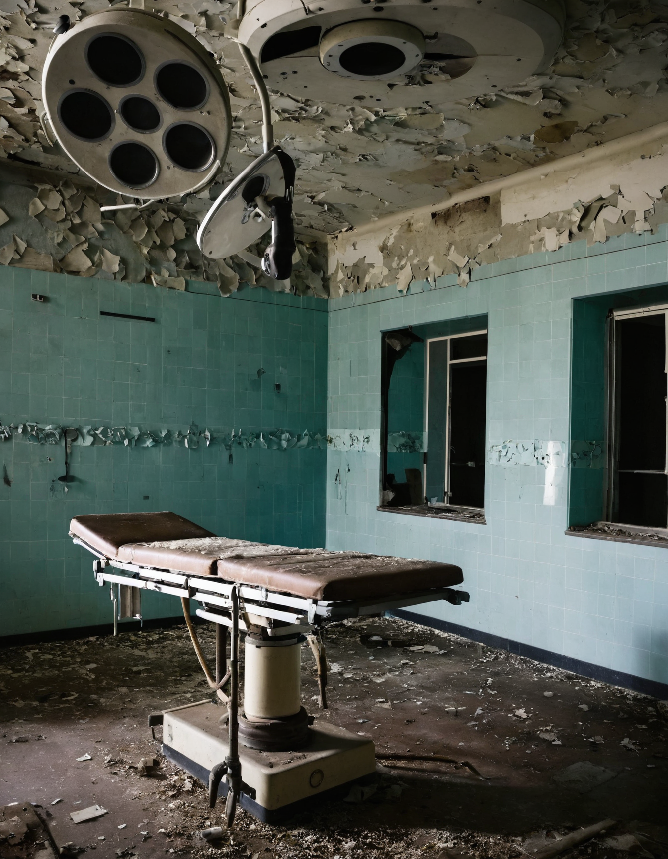 documentary photo <lora:JJsAbandonedHospital_XL:0.65> in abandoned surgical theatre