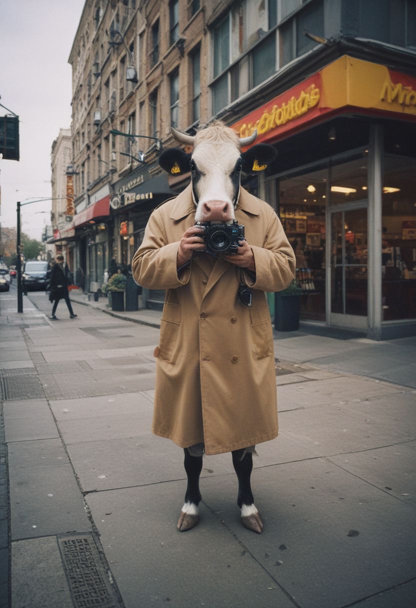full-length photograph of a ((cow in a trenchcoat)) holding an ((old 35mm camera)) to take photographs near a "McDonald's" restaurant in the city. Perfect photograph, strong fisheye-lens photograph (intense fisheye-view photograph), strong bokeh, cinematic photograph, experimental angles, experimental lighting, intricately detailed, very detailed background, realisticvision-negative-embedding, epiCRealism