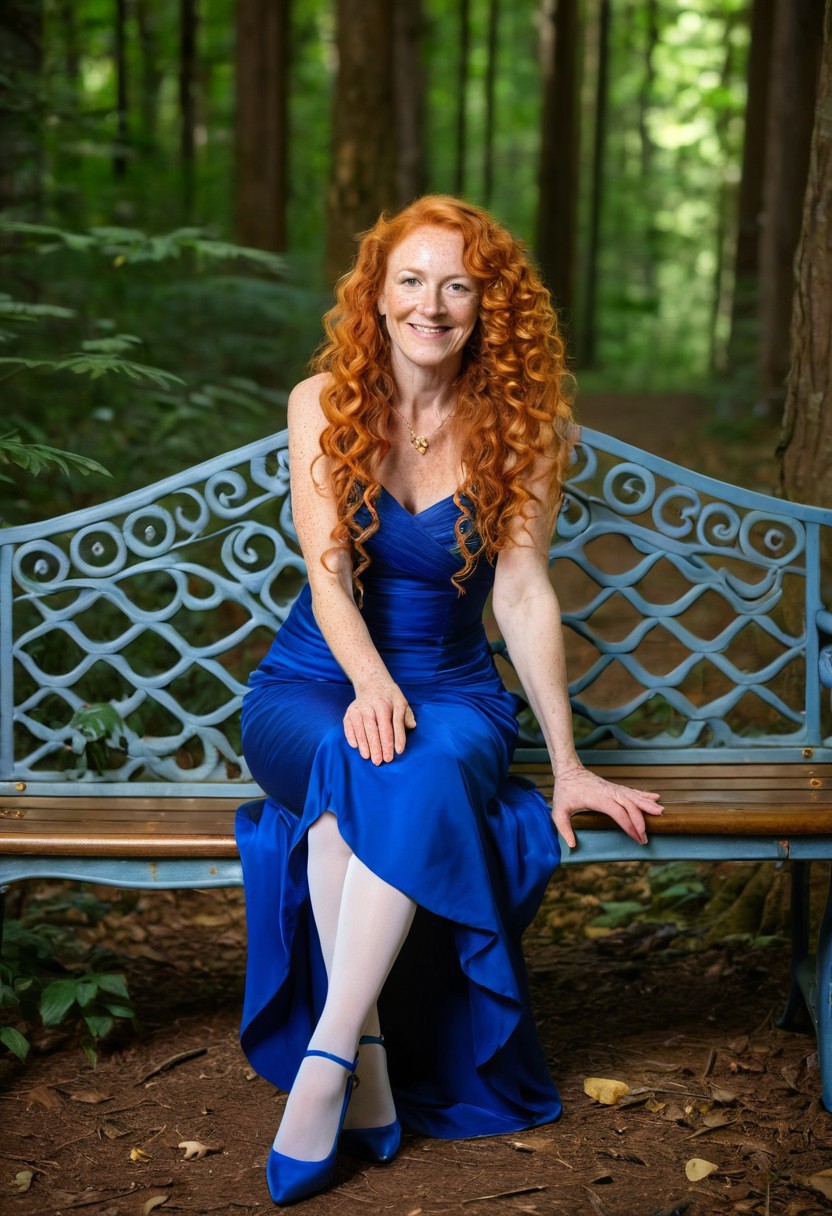 photograph of elegant beautiful woman age 42 with long curly orange hair and freckles in cobalt blue ballroom gown with gold highlights and blue shoes with white nylon stockings sitting on bench in the forest looking at camera with a smile