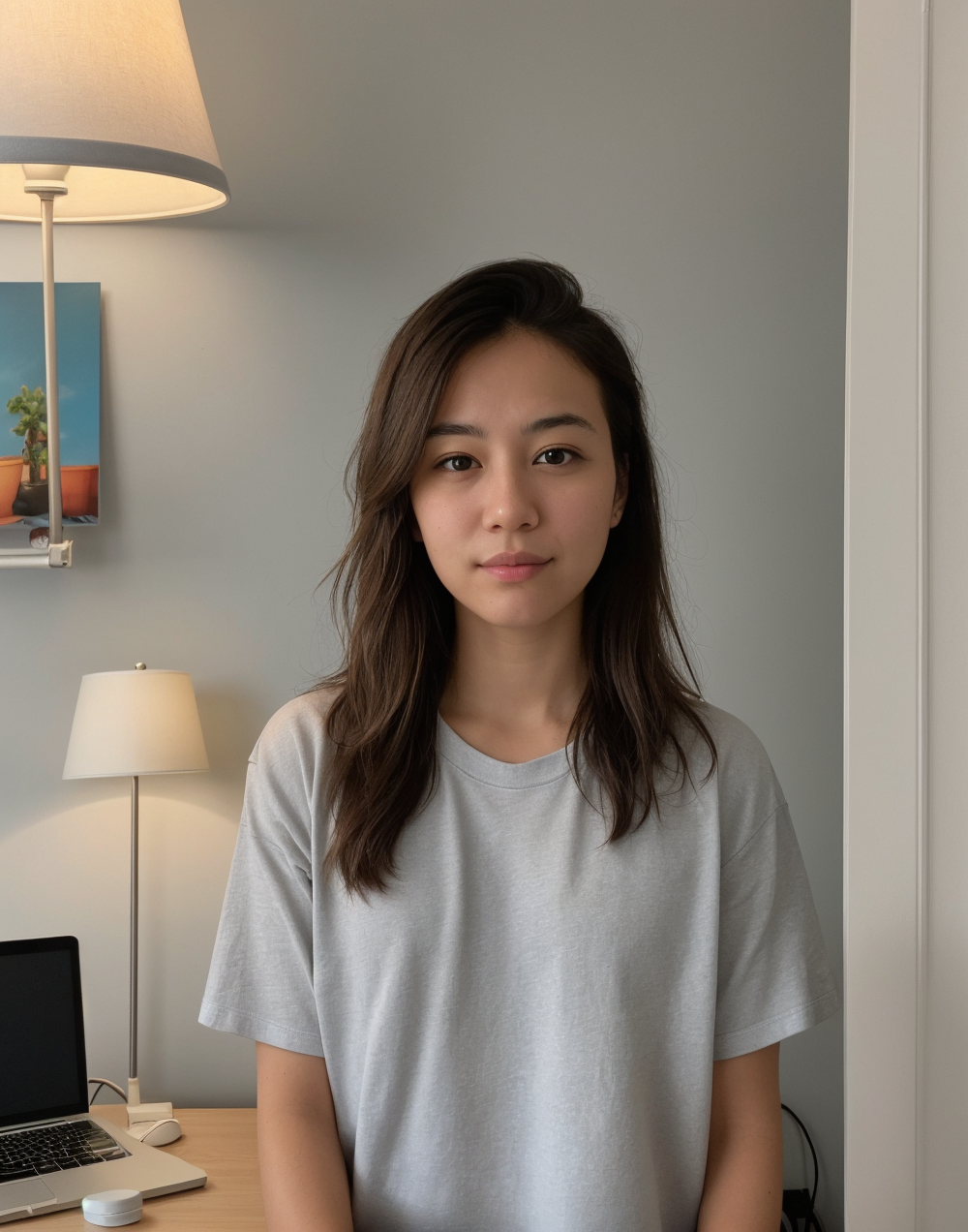 "Create a digital image that looks like a typical webcam photo. The image should be slightly grainy with lower resolution, showcasing natural but uneven lighting. The background should be simple, such as a plain wall or a home office setting with everyday items like a desk and a lamp. The subject, framed centrally, should show the head and shoulders with a relaxed expression, possibly looking at the camera. Casual clothing like a t-shirt or hoodie is preferred. Include subtle indicators of a webcam photo, such as a timestamp in the corner or slight lens distortion."