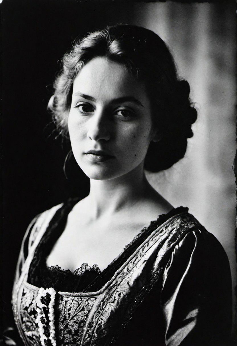 1700 french noble woman, face in shadow, low light, half body shot, 1700 french dress, dark mood, ilford hp5 analog film, medium format camera,artsy, shadows, wide angle, contact test, damaged print, faded, grainy,blurry, pixelated, motion blur, vignette, high contrast