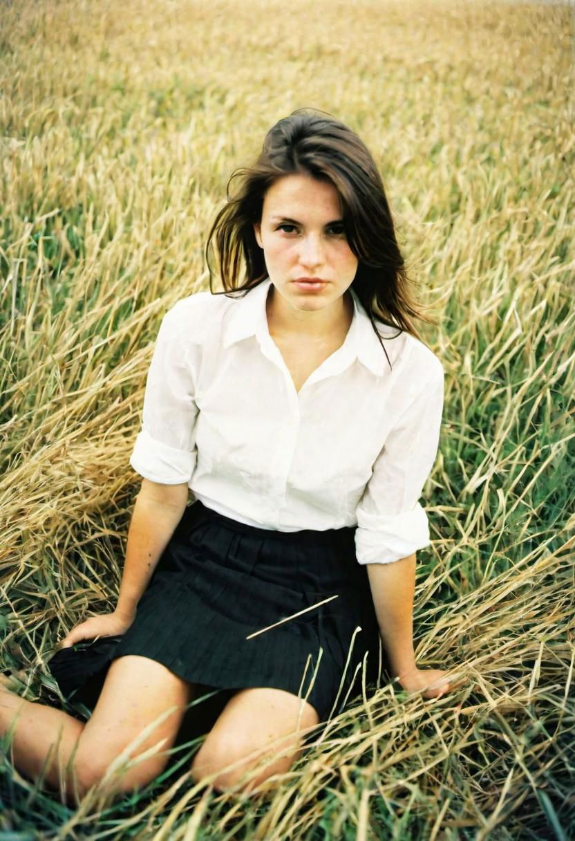 european woman 25 years sitting in a grass field, long grass straw, black skirt, white shirt,from top,half body, kodak ektar e100 analog film, artsy, harsh shadows, ultra wide angle, contact test, damaged print,flash,overexposed, faded, light leaks on print,grainy,blurry, pixelated, motion blur, vignette