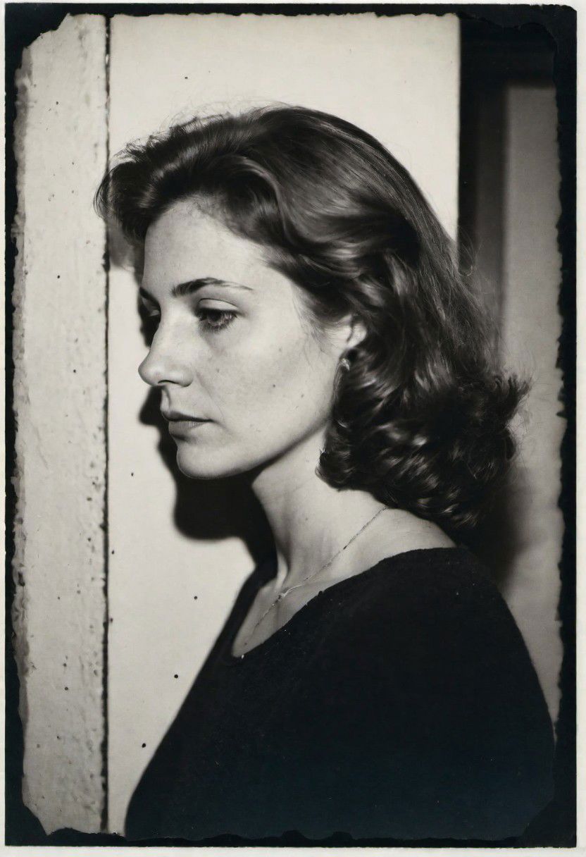 european woman 30 years 1978, in the basement, watching away, profile, half body shot, rule of third,polaroid b&w i-type analog film, medium format 6x7 camera, 80mm, shadows, contact test, damaged print, faded, grainy,blurry, pixelated, motion blur, vignette