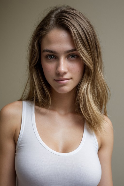 realistic analog photo, amateur photography, head on analog photo of Laura, feminine woman, 24 years old, fit body, toned body, realistic medium breasts, tan lines, birthmarks, shoulder length blonde wavey hair, Cute round face, fine features, arched eyebrows, round eyes, full lips, seductive smile, high-quality, sharp, high-resolution, fine detail, accurate colors, precise focus RAW, highres, 8k, uhd, fully dressed, wearing white t shirt,