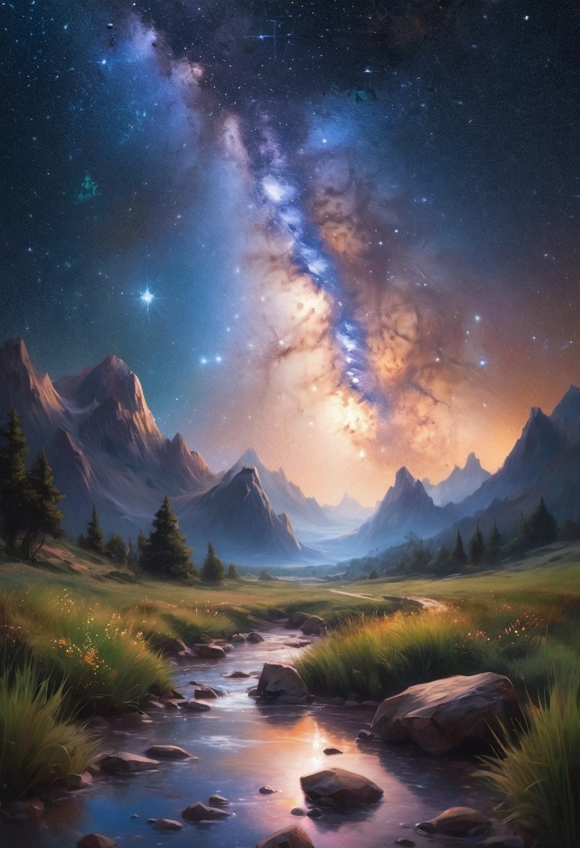 nature photo, landscape, the starry sky, the milky way, canvas, oil, natural colors, by Ross Tran