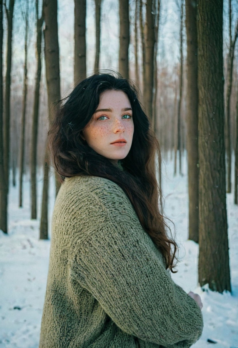 A portrait of a girl, wavy hair, black hair, Green eyes, standing in a forest in winter, warm clothes, looking at viewer, snow flakes,, freckles, pale skin, realistic, photo, golden hour, cinematic lighting, celluloid film skintone color style, earthy colors, blue colors