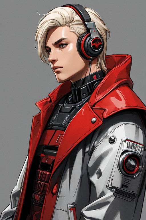 Retropunk, cyberpunk, android man, middle part hair, platinum blonde, male kpop idol hair, red robot headphones, robotic parts, red coat, tall, simple background, focus on face