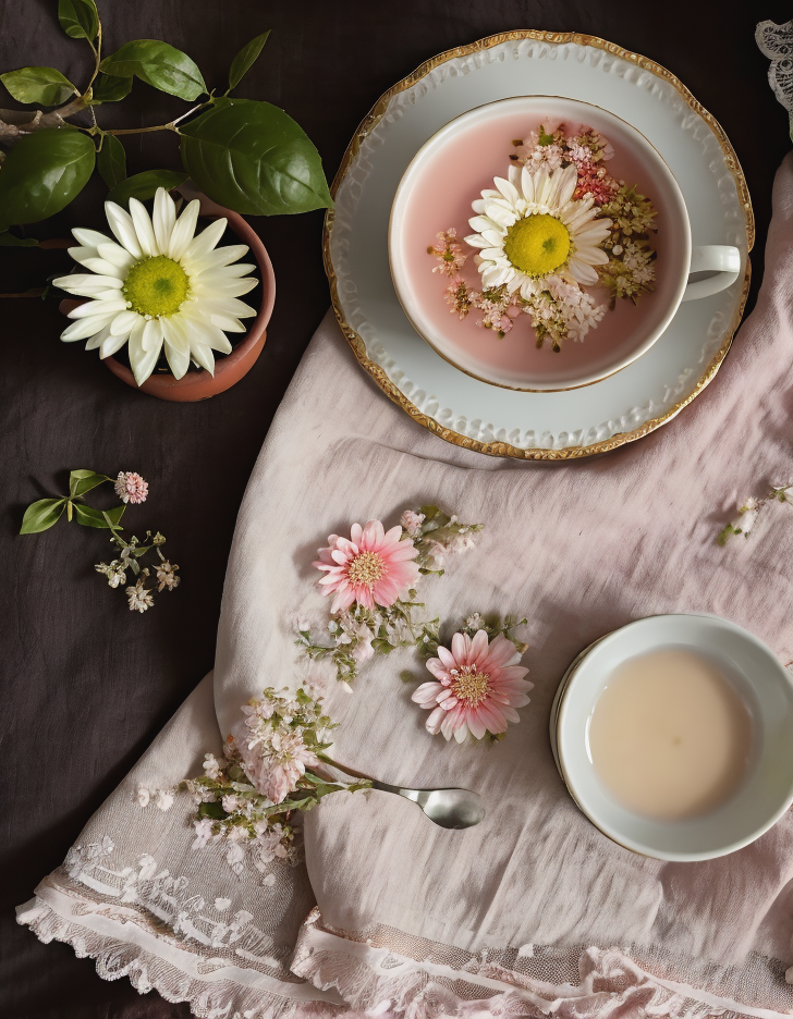 RAW photo, subject, 8k uhd, dslr, high quality, film grain, Fujifilm XT3, professional photo, (detailed skin:1.3), high quality, <lora:Floral_Academia:0.8> , floral academia style, floral academia, (floral academia scene), book, sunlight, floral academia still life, tea, brown, dark, potted plant, sitting, from above, pink eyes, lace, tablecloth, fruit,