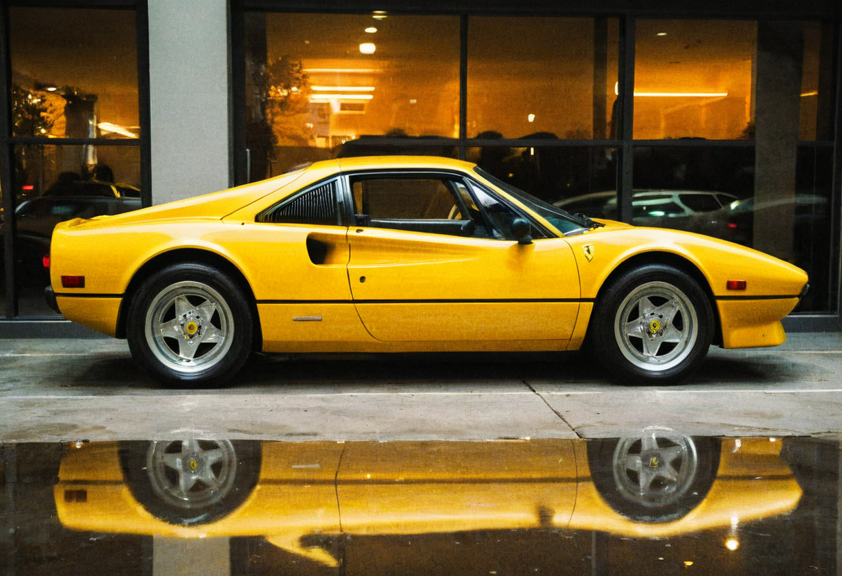 analog film photo (Sportscar, gleaming yellow Ferrari 308, rear side view, indoors, dark luxury parking lot, bright neon lights, reflections, night), (film grain:1.3) . faded film, desaturated, 35mm photo, grainy, vignette, vintage, Kodachrome, Lomography, stained, highly detailed, found footage