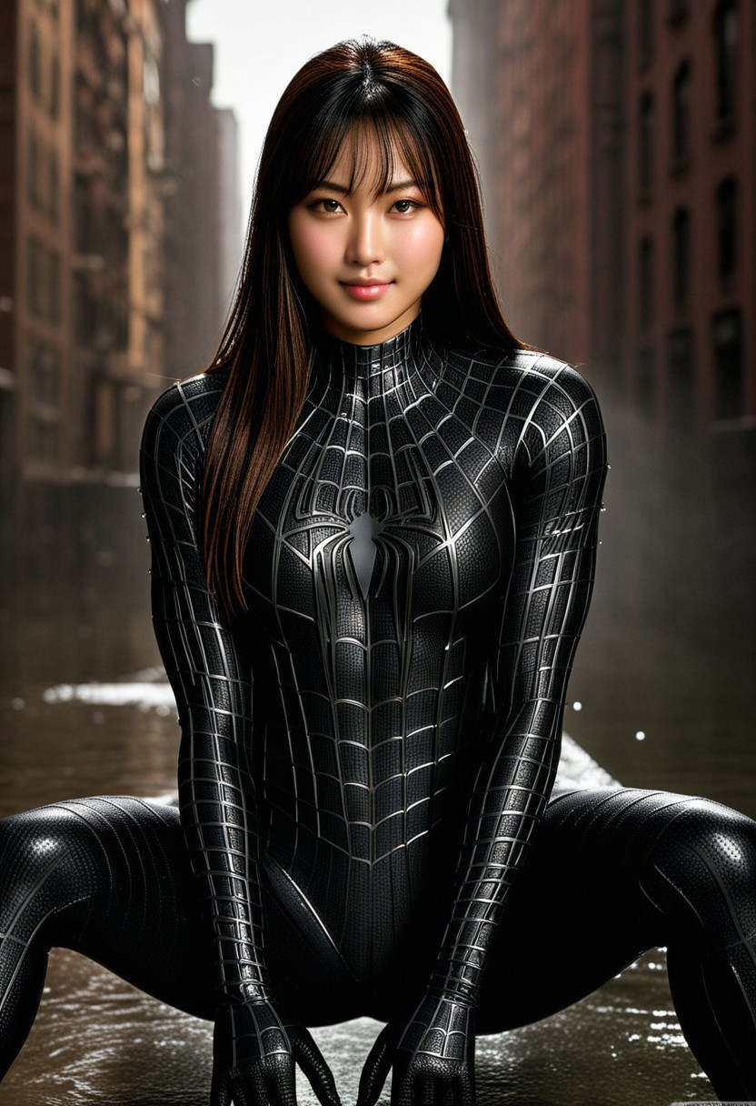 score_9, score_8_up, score_7_up, best quality, realistic, masterpiece, beautiful detail, hyperrealistic, woman ((1girl, woman body, big breasts)), amazing detailed full body portrait of a beautiful japanese girl, wearing a realistic and highly detailed black raimi spider-man suit, ((huge muscular girl)), professional model wears ultra - detailed black raimi spider - man suit, ultra - detailed and grained black raimi spiderman suit, suit covered entire body and hand, black spiderman gloves, wet, (cute hand pose, sitting pose, smile), (full body), (dirty skin), close up, octane render, highly detailed, volumetric, dramatic lighting, (highest quality:1.1), (HDR:1.3), (top quality, best quality), realistic, high definition,