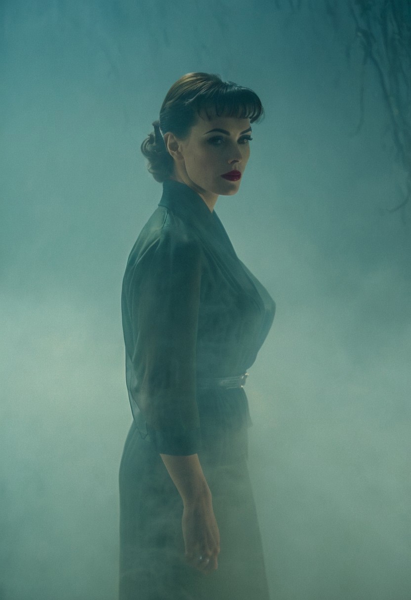 (Film grain:1.6), cinematic quality, (1950s, retro:1.8), Hollywood actress as a character (from the movie Blade Runner, in the style of Blade Runner 2049:0.4), fine art photography, film still, movie scene, fog, atmospheric