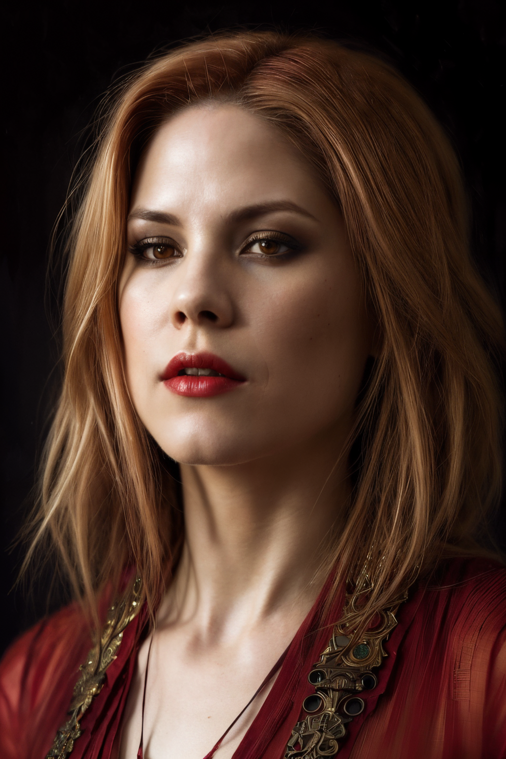 portrait photo of mko,(red vampire style shirt), (dirty blonde hair), alluring portrait, intricate, highly detailed, digital painting, artstation, concept art, naughty, sharp focus, cinematic lighting, illustration, art by artgerm and greg rutkowski, alphonse mucha, cgsociety,<lyco:MarianaKlaveno-RealVision-V1.0:1.0>,