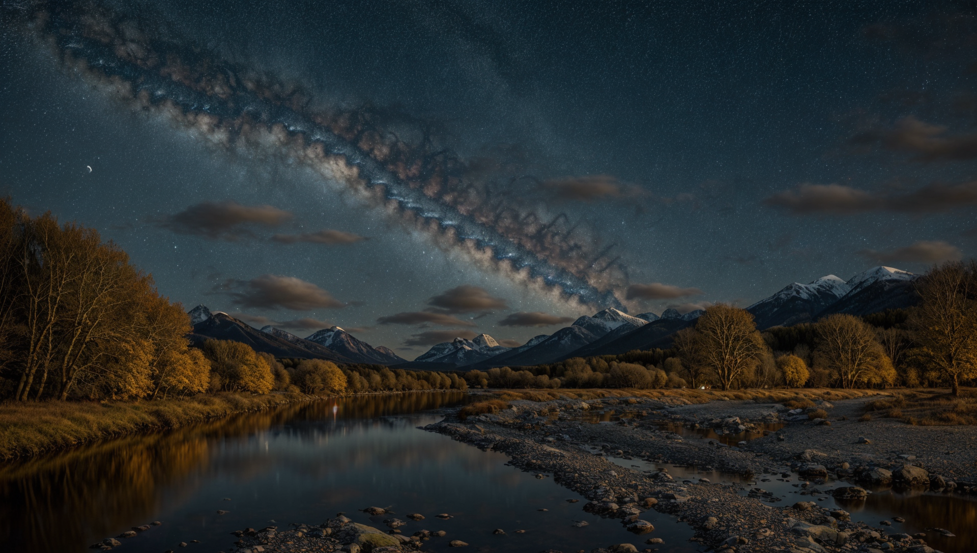 ((masterpiece:1.4,best quality)), cloud, outdoors, night, stars, moon (mountains), spring glade, scenery, sky, winter, village, tree, river, high detail, abundant, 8k, high detail, wallpaper,