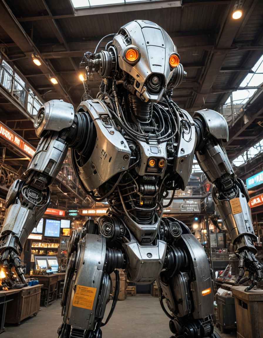 nomad trading post, traveling merchants, bartering, diverse goods (combustion, worm's eye view:1.2), Cybernetic robot , android, AI, machine, metal, wires, tech, futuristic, highly detailed, (masterpiece, intricate details:1.2)