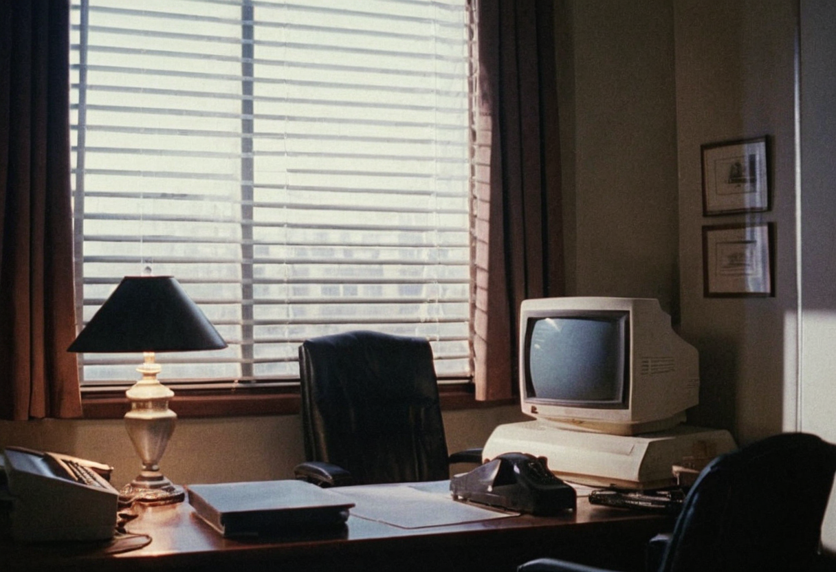 analog film photo XFiles, office, vintage computer, lamp, indoors, window, blinds . faded film, desaturated, 35mm photo, grainy, vignette, vintage, Kodachrome, Lomography, stained, highly detailed, found footage