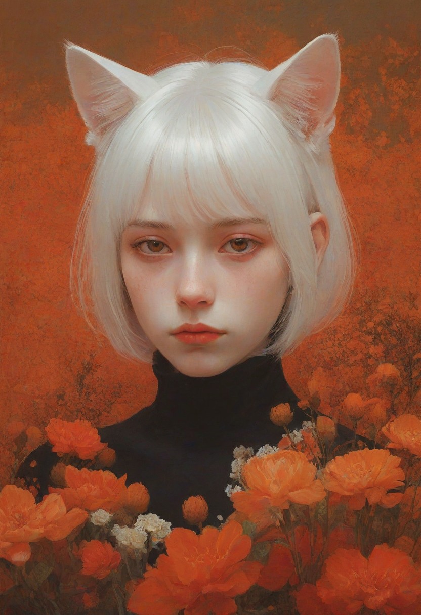 `white hair, shoulder-length hair, straight hair, 20 years old, catgirl, cat ears, cute, pale skin, blushed face, snub nose, flowers, collar, orange theme, red theme, digital artwork by Beksinski, portrait