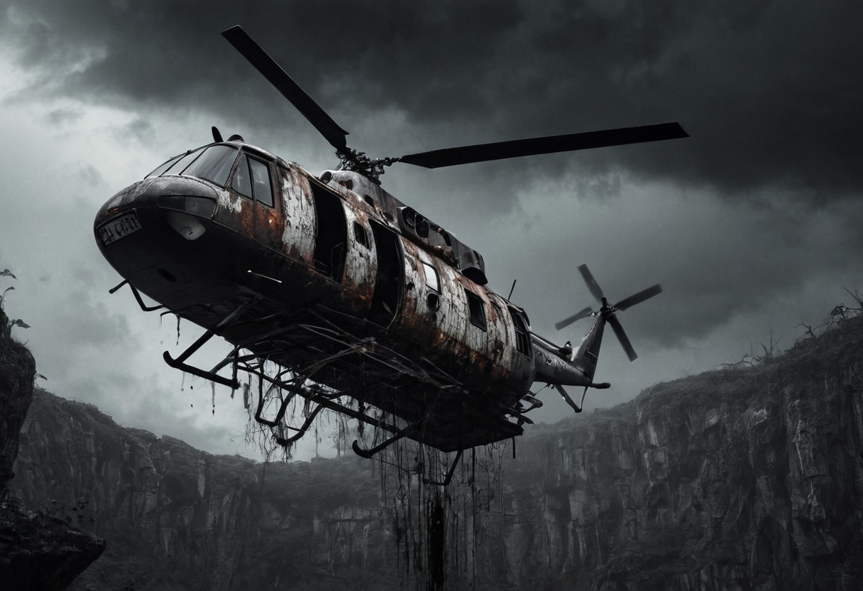 horror-themed A rusted helicopter flying around a fantastic modern house in a cliff in the middle of a storm, mostly black and white, swamp, shadowy creatures, eerie, unsettling, dark, spooky, suspenseful, grim, dark themed background.