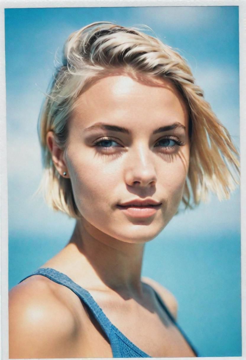 polaroid photograph Color i-Type Film, portrait, 1 girl, blonde, short hair with small braids, perfect eyes, pointed jaw, sky blue cropped tank top, white wall in the background, natural light.