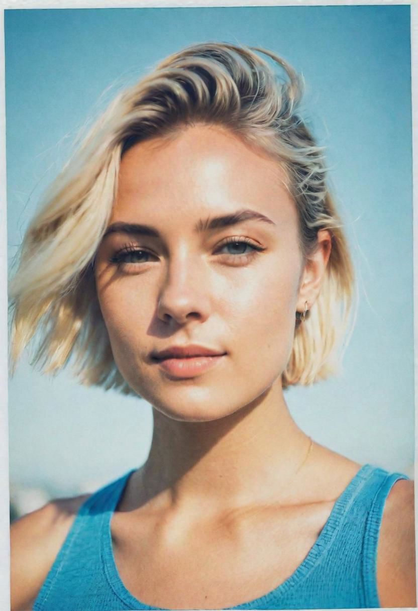 polaroid photograph Color i-Type Film, portrait, 1 girl, blonde, short hair with small braids, perfect eyes, pointed jaw, sky blue cropped tank top, white wall in the background, natural light.