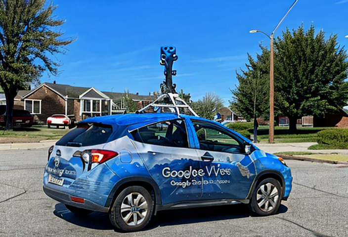 (gsv car), (google streetview car), city, (car spotting), blue car, american suburb, high definition, hd, 8k, 4k, absurdres, highres, <lora:Google_Streetview_Car:1>, (backview)