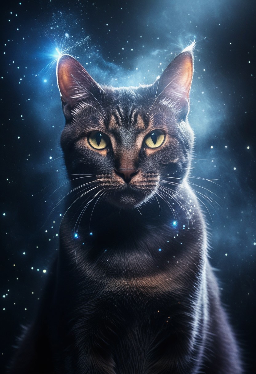 score_9, score_8_up, score_8, dark, black background, cat in the center, looking at the viewer, sparkles around, glow, mist, insane details, intricate details, hyperdetailed, low contrast, soft cinematic light, dim colors, exposure blend