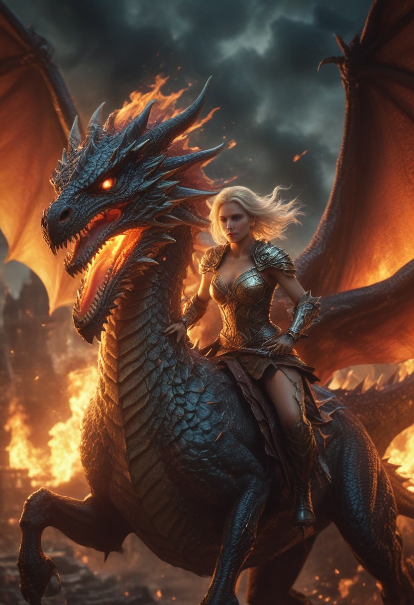 epic fantasy castel, beautiful realistic Dragon Rider warrior girl, flying in battle on a terrible dragon, 8k, blonde hair,fire, Burning town, ultra realistic, cinematic style, perfect athletic body, hot, sexy, cute, Attractive girl, dynamic lighting, defiant and seductive, cinematic colors Lighting