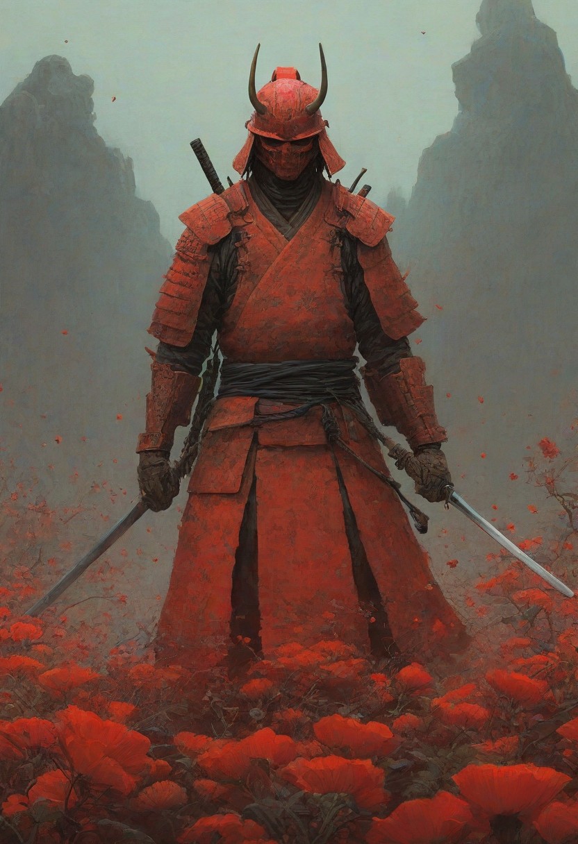 digital artwork by Beksinski, samurai, flowers, vibrant colors, red theme, gray theme