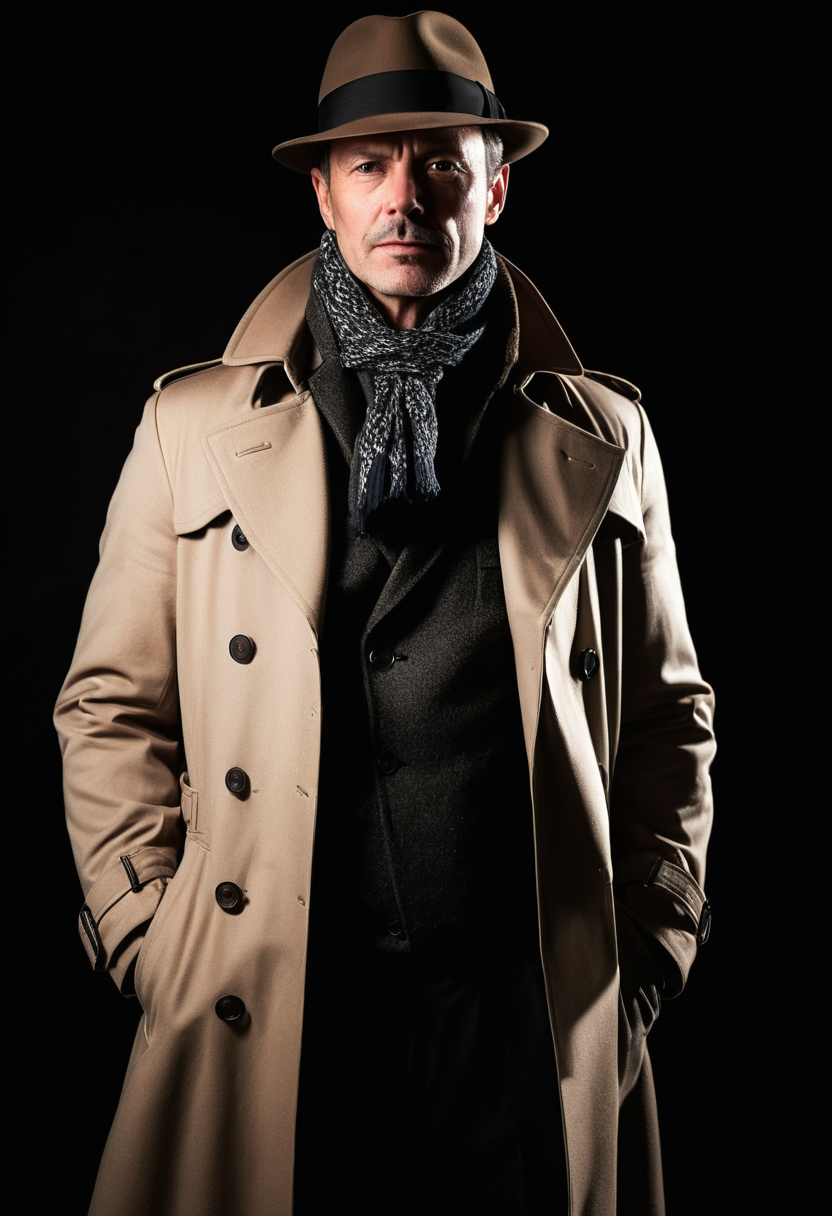 score_9, score_8_up, score_7_up, BREAK, manly mature man, 40 years old The Shadow, scarf, mask, fedora, short hair, trench coat, cape, gloves, belt, ring, pants, black background, spotlight dynamic angle, vibrant lighting, high contrast, dramatic shadows, highly detailed, detailed skin, depth of field, film grain,