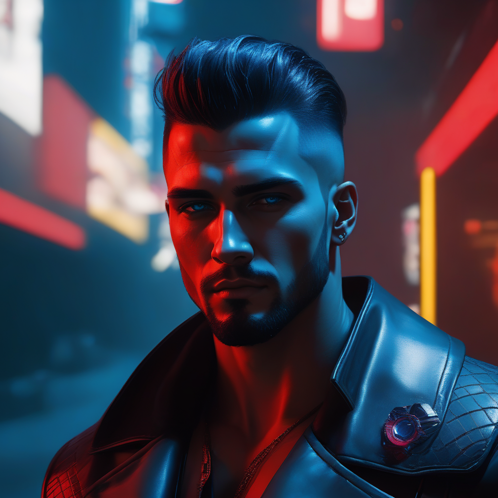 masterpiece,cyberpunk 2077 style, <lora:3DCyberpunkStyleXL:1.4> Cyberpunk portrait blending acrylic paint wash pouring techniques, Dean Stockton's touch, Alvaro León's flair, acrylic brush work, boasts a young man with meticulous facial features, pupils etched with extreme detail, skin rendered with softness, strong jawline, sculpted cheekbones, chin projecting prominence, sleek modern pompadour, neon blue and vibrant red digital aesthetic casc, Mysteriousï¼