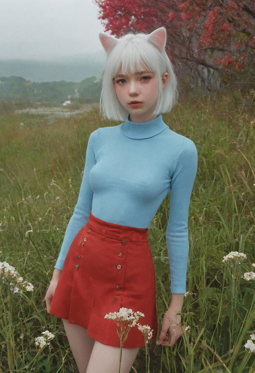 flat chest, thin arms, thin legs, cute, eyelashes, white hair, shoulder-length hair, straight hair, 1girl, 20 years old, catgirl, cat ears, cute, pale skin, blushed face, crop top, erect nipples, snub nose, grass, lake, flowers, naked, collar, pale skin, blushed face, flat chest, hair clip, panties, cameltoe, red theme, light blue theme, digital artwork by Beksinski,