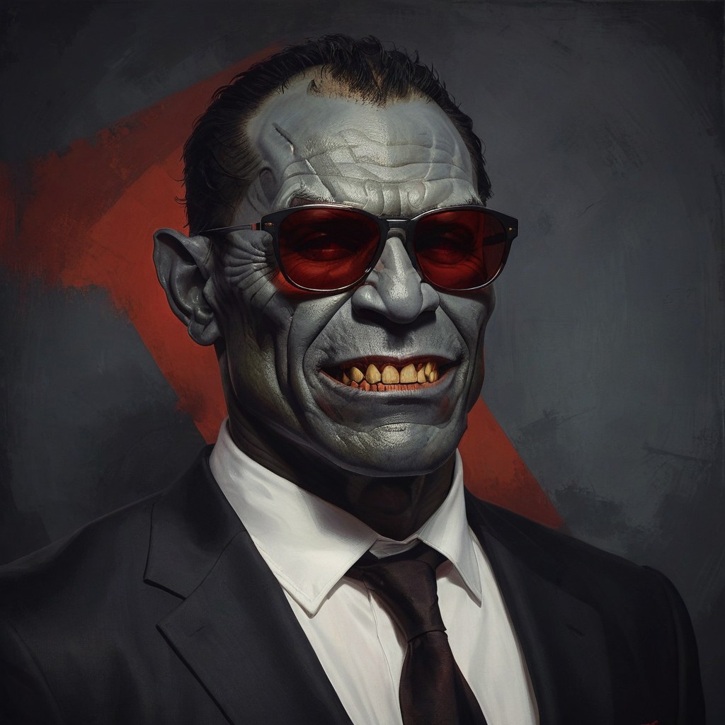 closeup portrait of a orc wearing black suit, highly detailed, evocative, high contrast, red and gray color blocks as the background, retro style sunglasses, smile face, gray skin face