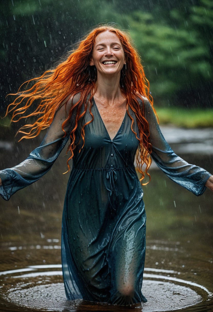 A captivating, cinematic day time photo of an elegant beautiful (older:1.2) woman, (age 50:1.2), dancing in the rain, happily smiling, arms out, with long curly dark orange wet hair mixed with wisps of grey hair, (freckles:1.3), wet skin, looking at camera, full body view. She is dressed in an exquisite, dark blue and orange transparent wet nightgown. Her long orange hair flows elegantly, and her eyes are a striking shade of green. Matching slippers enhances her look. The background is a shallow creek, DarkFantasy, photo, cinematic,