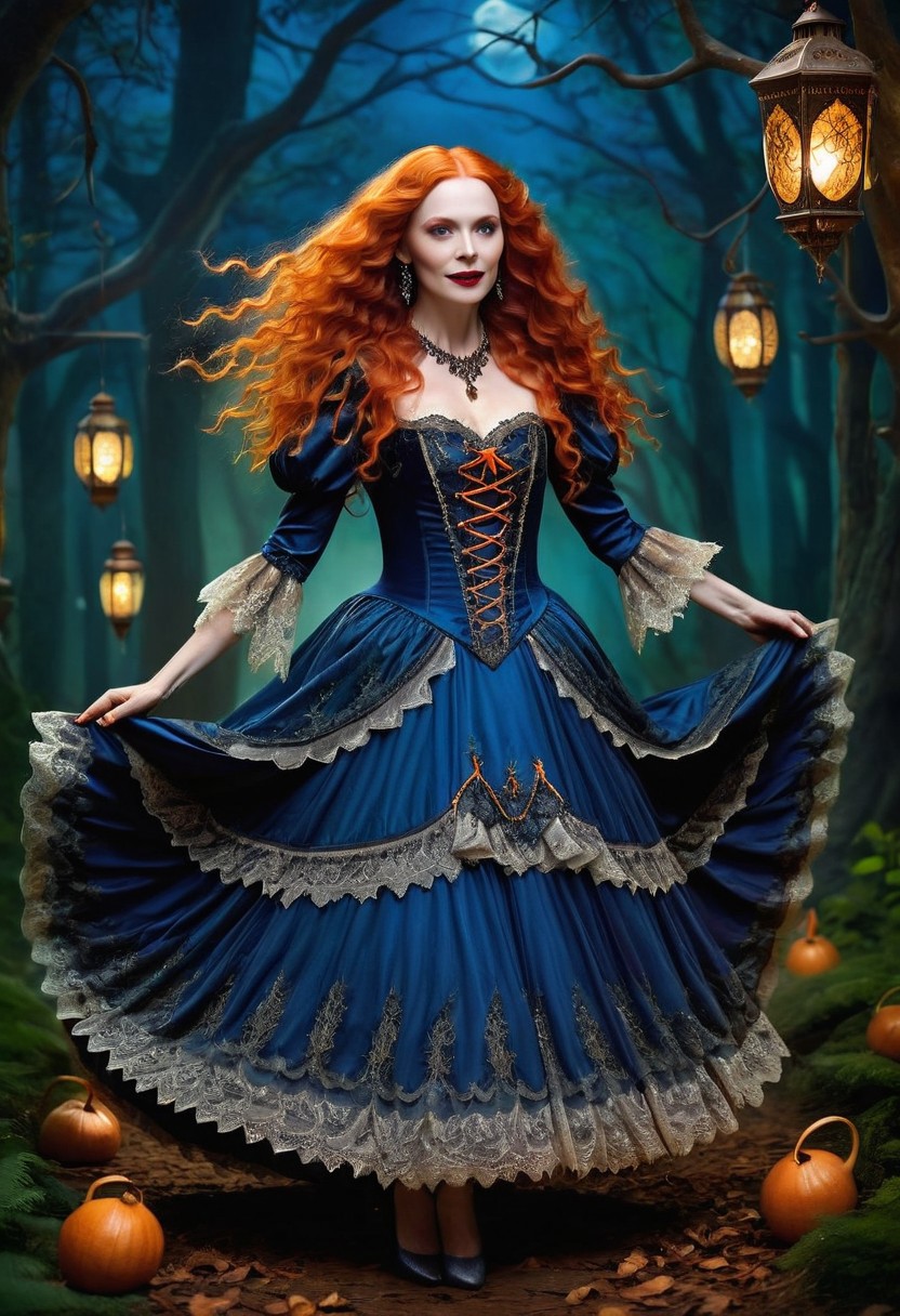 A captivating, cinematic night time photo of elegant beautiful goth vampire woman slowly dancing, slight smile, arms out, smiling, age 50 with long curly orange hair and freckles, full body view. She is dressed in an exquisite, orange and royal blue Victorian dress adorned with intricate lace and silver thread patterns. Her long orange hair flows elegantly, and her eyes are a striking shade of green. Matching slippers enhances her look. The background is a mystical, moonlit forest glowing lanterns, dark shadows, creating an atmosphere of supernatural enchantment., h4l0w3n5l0w5tyl3DonMD4rk, photo, cinematic,