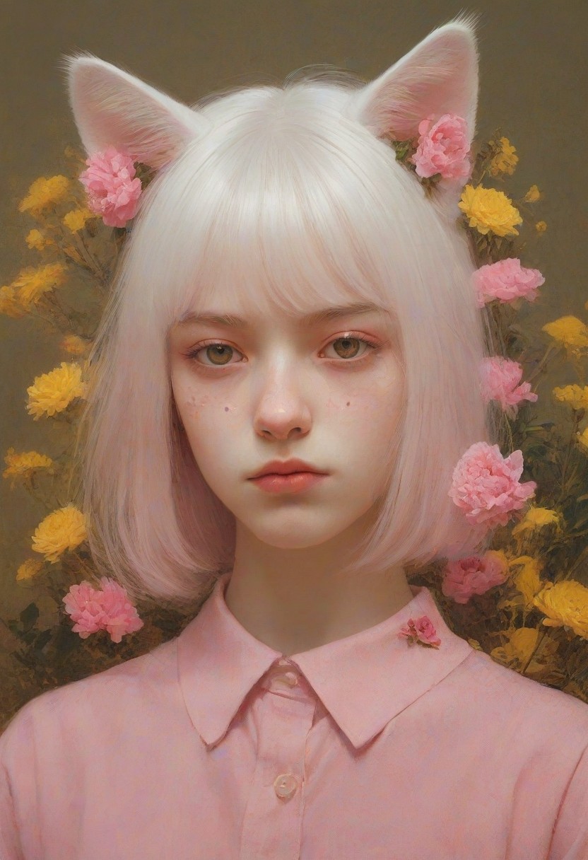 `white hair, shoulder-length hair, straight hair, 20 years old, catgirl, cat ears, cute, pale skin, blushed face, snub nose, flowers, collar, yellow theme, pink theme, digital artwork by Beksinski, portrait