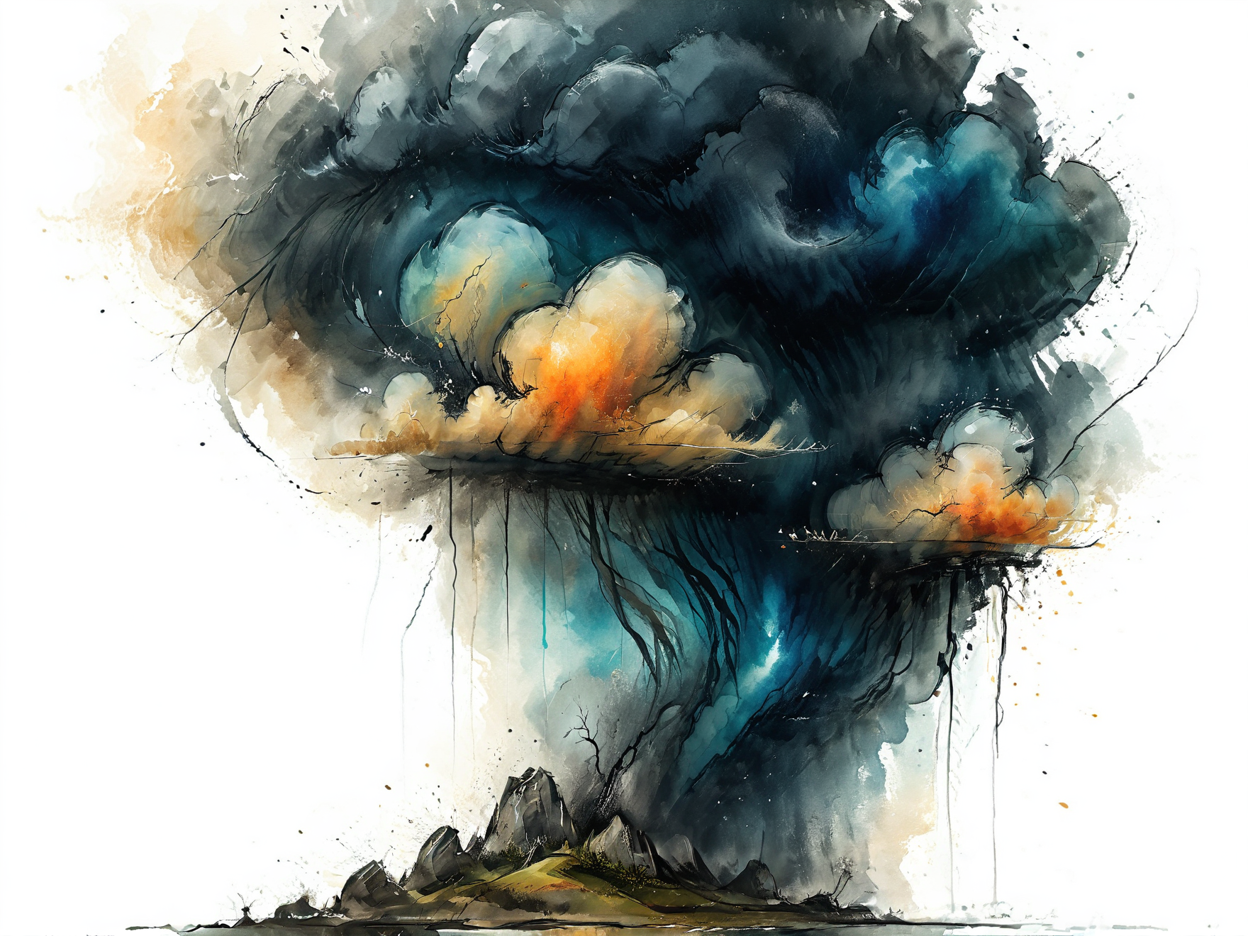 landscape scenery, watercolor and ink style, white background, artistic and abstract, key visual, ink painting art, vibrant colors, minimalism, soft brush strokes, thunderstorm <lora:Cute_Drawing:0.8> <lora:hyperkraximalism_v1-1:0.8>
