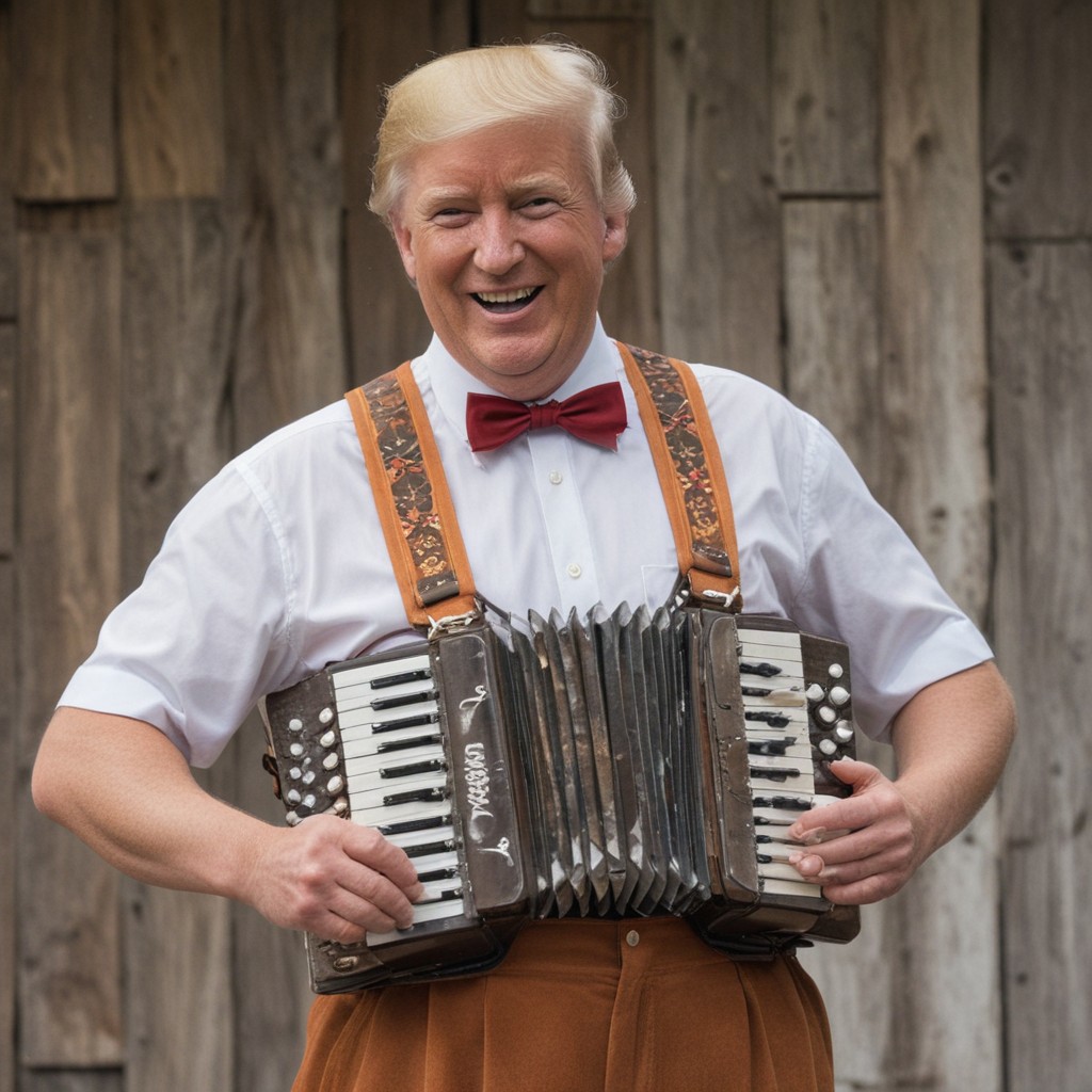 score_9, score_8_up, score_7_up, trump_ice, looking at viewer, 1boy, orange skin color, blonde hair, open smiling mouth, bare chest, lederhosen, white hair, blurry background, realistic, old man, Donald Trump wearing lederhosen, and short shorts, playing wooden accordion, Bavarian hat, smiling