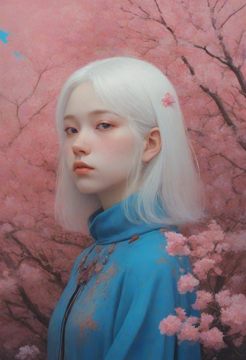 white hair, shoulder-length hair, straight hair, 20 years old, cute, pale skin, blushed face, snub nose, flowers, collar, blue theme, pink theme, digital artwork by Beksinski, portrait, sakura, vibrant colors