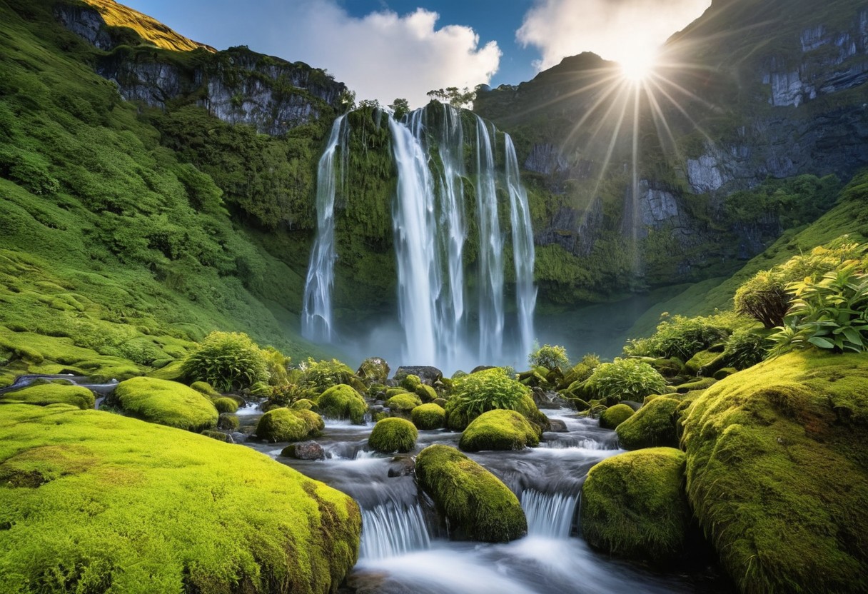 realistic, extremely high quality RAW photograph, intricate, Exquisite details and textures, highly detailed, ultra detailed photograph, 4k, high resolution,The image shows a vibrant natural landscape during sunrise. In the foreground is a multi-tiered waterfall, flowing over green moss-covered rocks. The movement of the water is captured so that it appears silky and smooth. Surrounding the waterfall are various green plants and herbs, indicating a lush environment. In the medium shot, there are more green trees and bushes on both sides of the waterfall, leading to a mountain range in the background. The mountains have jagged peaks and are partially covered by shadows, they are quite high. The sky above is partly cloudy with shades of blue and soft yellow near the sun. The sun is positioned right on the edge of one of the mountain peaks, creating a dramatic burst of rays of light that spread across the sky and illuminate parts of the clouds.