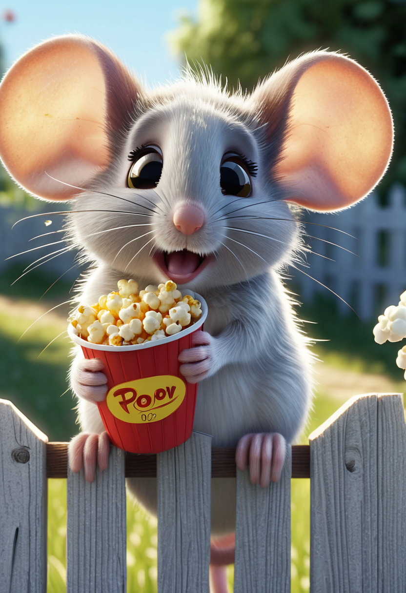 a close up of a cute mouse with a large piece of popcorn, sitting on a picket fence, Disney Pixar movie still, depicted as a Pixar character, Disney, animation, hyper detailed, 3d animation style, cute character design, rendering, cgi, 1024K