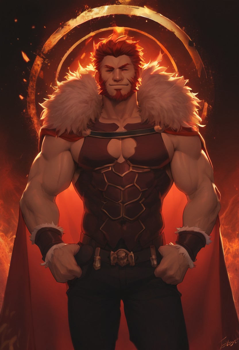 score_9, score_8_up, score_7_up, score_6_up, score_5_up, score_4_up, 1man, iskandar_(fate), male focus, mature male, muscular man, military uniform, cape, surrounded by fire, detailed background, dramatic lights