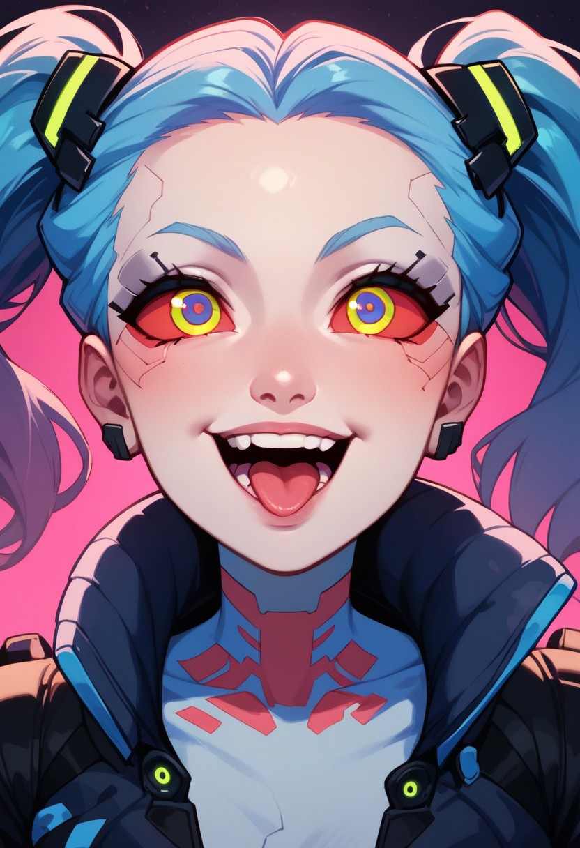 score_9, score_8_up, score_7_up, i want the whole image to be created in 3D anime style, 1girl, solo, long hair, pigtails, looking at viewer, smile, open mouth, shirt, mechanical eyes, COLORED SCLERA, RED SCLERA, violet pupil, cobalt blue hair, earrings, teeth, tongue, oversize open jacket, eyelashes, pink tattoo, stark white skin with a faint blue, smiling, cyberpunk, portrait, rebecca (cyberpunk edge runners)